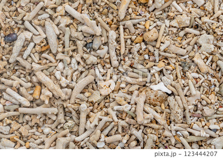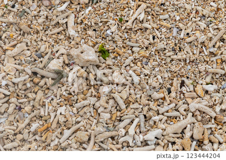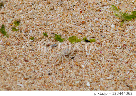 沖縄県北谷町、砂辺馬場公園の砂辺海岸付近に広がるサンゴ礁の白い砂浜に隠れる白いカニ(擬態)
