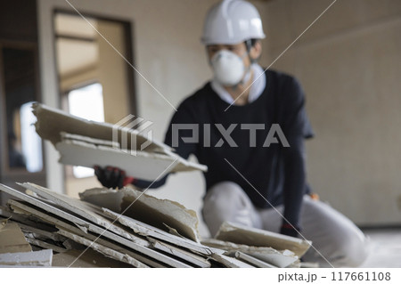 浄化槽のコンクリートを割る作業員