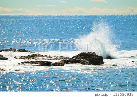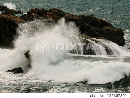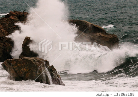 岩礁に砕け散る大波、飛ぶ波しぶき