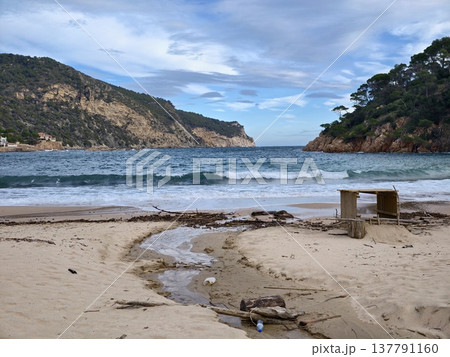 Spain, Valencia, March 29, 2022: Seaweed Debris Covering Sandy Beach in Overcast Weather by the Coast