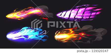 Laser and plasma blaster gun game effect of cartoon energy blast or fire beam, vector VFX set. Laser gun or plasma blaster game effects of lightning or magic energy blasts with flame shot or fireball
