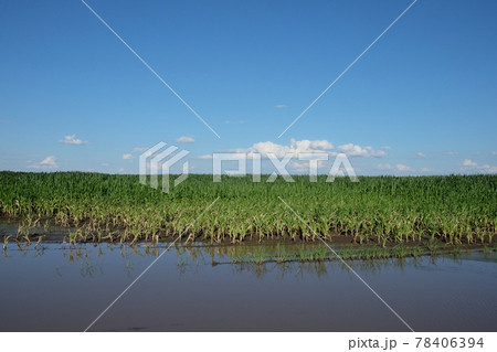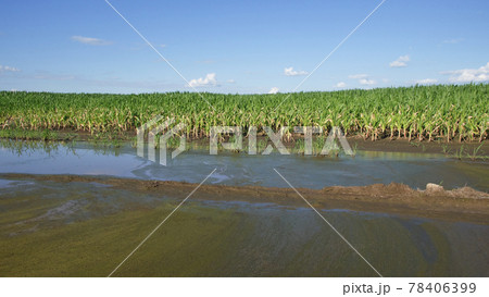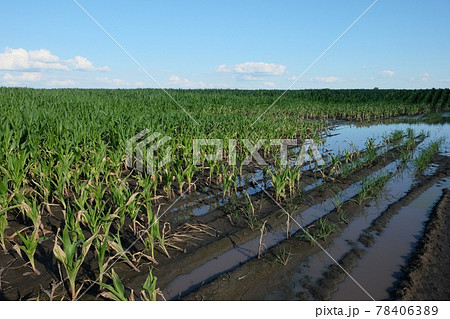Water-flooded corn crops. Flooding in agricultural areas. Scenery.