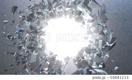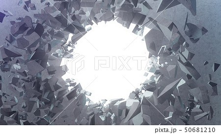 Broken concrete wall into small pieces. Cracked earth, abstract background with volume light rays in