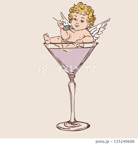 Colorful vector illustration of a cute Cupid angel in cocktail. Romantic love symbol perfect for Valentines Day cards, wedding designs, posters, invitations and festive decor.