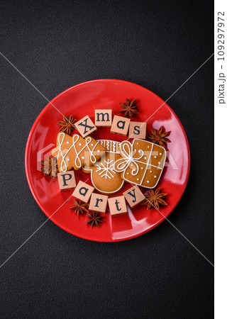 Christmas party inscription with wooden cubes on a dark concrete background