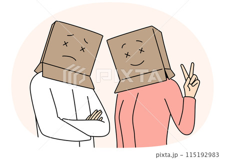 People with cardboard boxes on heads look at screen with sad or cheerful emotions