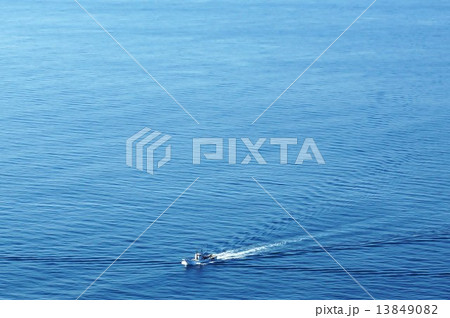 海の背景素材・凪いだ真っ青の海を航行する漁船・横位置