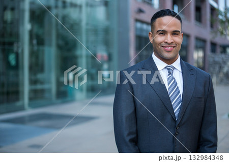 African American man standing on paved walkway outside modern office building in suit, copy space