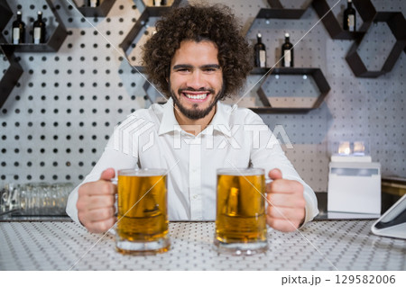 Man holding two frothy beer mugs and leaning behind perforated bar counter with honeycomb shelves