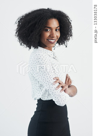 Business, happy and portrait of black woman with arms crossed in studio isolated on a white background. Confidence, face and African female professional, entrepreneur or person from South Africa.