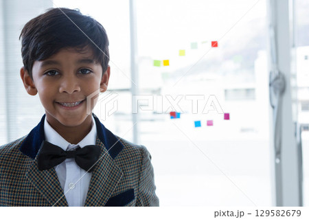 South Asian boy standing in glass-walled room with sticky notes wearing blazer, copy space