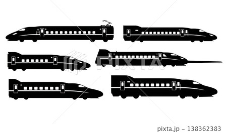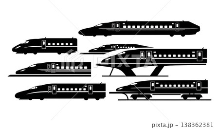Black Solid High-Speed Bullet Trains and Maglev Trains Silhouettes Set of Six on White Background