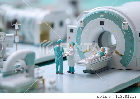 Modern hospital MRI scanner with a medical bed in a clean and bright examination room. Advanced diagnostic imaging technology.