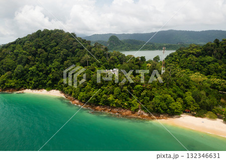 Top view of a tropical beach on Langkawi Island on a sunny day. Skulls Beach in Malaysia. Pasir Tengkorak Beach