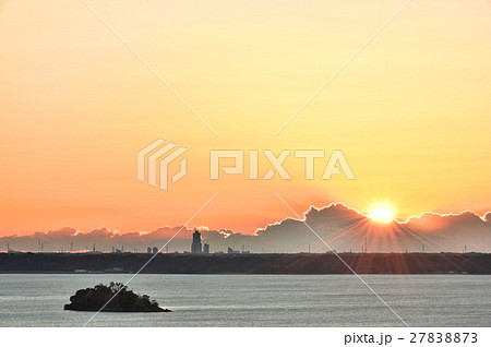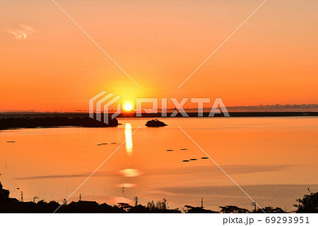 オレンジ色に染まる朝 浜名湖礫島のシルエット