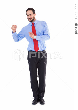 Composite image of businessman standing with arms out