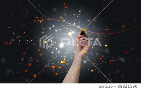female hand holds a marker and draws connections in the structure of the global network for the exchange of information between users. Global business network concept