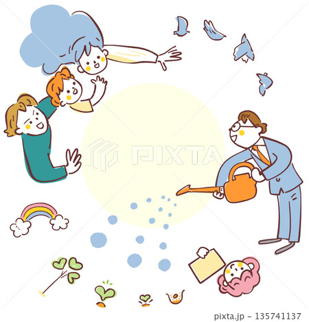 未来の芽吹き:子育て支援や行政サービスをイメージした窓から顔を出す家族と水やりをするスタッフのイラス