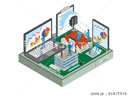 建設現場と企業のクラウド化をイメージしたアイソメトリックイラスト