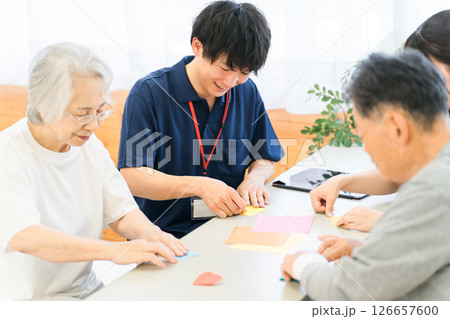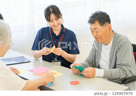 老人ホーム,介護施設で働く介護スタッフの男女と折り紙をするシニア男女
