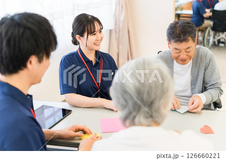 グループホーム,老人ホームでトランプをする高齢者と介護士の女性スタッフ