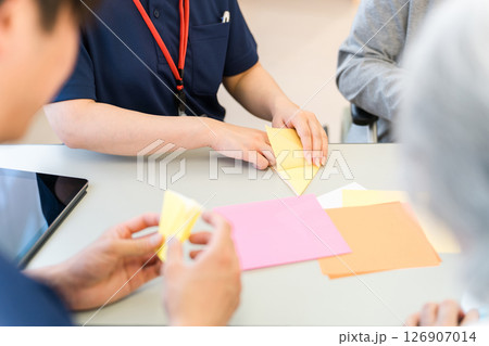 グループホーム,老人ホームで折り紙をする高齢者と介護士の男女スタッフ