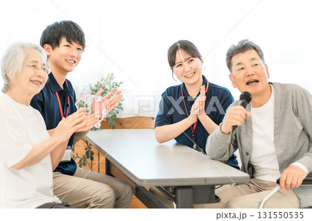 グループホーム,老人ホームでカラオケをする高齢者と介護士の男女スタッフ
