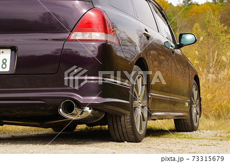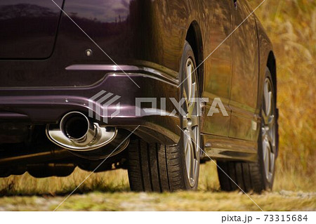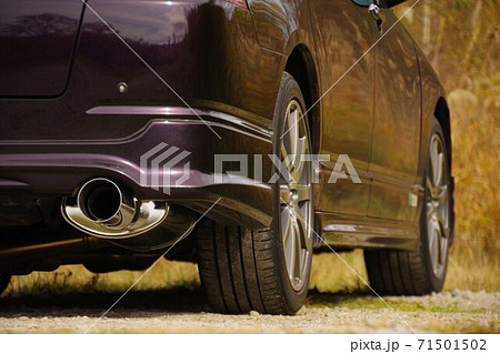 高性能な乗用車の後輪周りをローアングルで撮影した写真