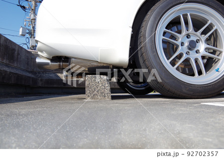 乗用車のバック駐車で車止めとマフラーがギリギリ当たらない状態