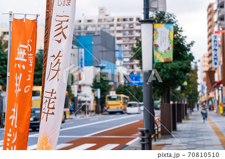 東京、下神明天祖神社 稲荷社の赤い鳥居と奉納旗