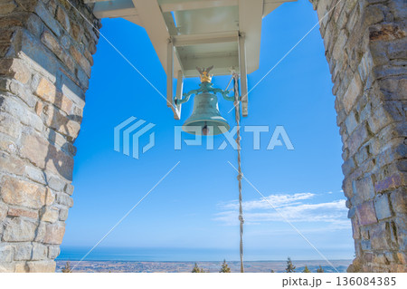 深山鎮魂の鐘と青空 山頂から祈りを捧ぐ静謐の風景