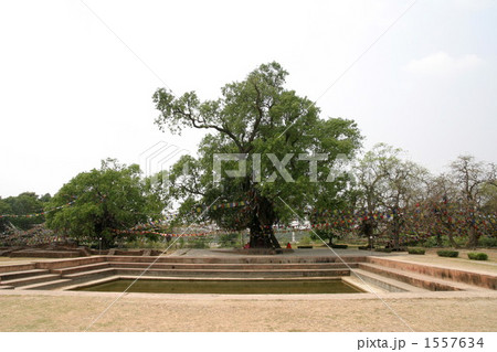インド、ブッダガヤ、仏陀の蓮池とタルチョ(祈祷旗)