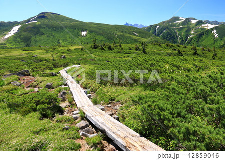 北アルプス 雲ノ平を取り巻く山々木道越しの祖父岳と三俣蓮岳と槍ヶ岳遠景 日本最後の秘境を歩く
