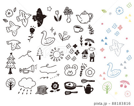 白黒、モノトーン、線画のイラスト(手書き、オシャレ、ファッション、北欧、鳥、花)