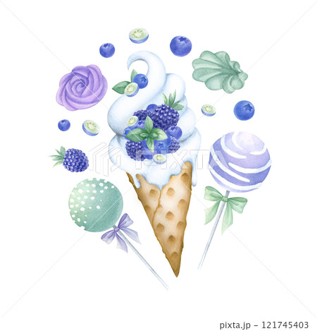 Ice cream in waffle cone with blueberry, blackberry and mint. Marshmallows and cake pops. Hand drawn watercolor isolated illustration delicious desserts in purple and green colors for food design.