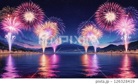 湖畔に咲く花火 - 夏の夜空を彩る壮大な光景