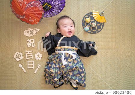 袴姿の和服で百日祝い 生後100日の赤ちゃん お食い初め