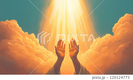 A serene depiction of hands reaching towards a divine light breaking through clouds