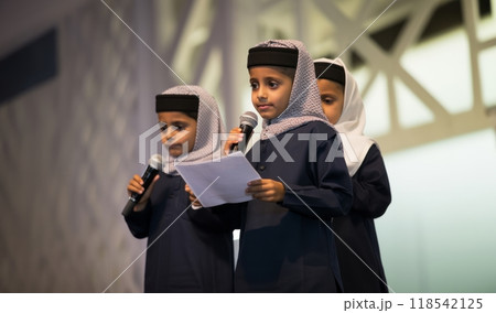 Closeup of Muslim children in elegant attire reciting the Quran, showcasing their devotion and cultural heritage..Generated image