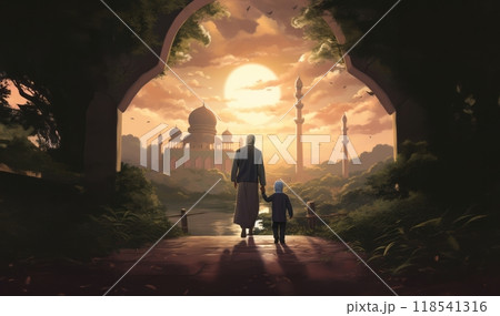Father and Son in Ihram at a Sacred Site During Their Pilgrimage.Generated image