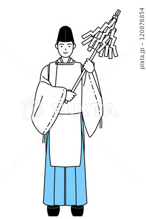 笏を持つ神社の神主、烏帽子と狩衣姿