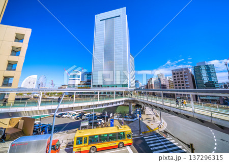 日本の横浜都市景観3月4日。桜木町駅入口交差点や横浜市役所、ロープウェイなど望む