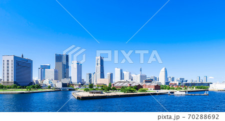 日本の横浜都市景観横浜みなとみらいや飛鳥Ⅱ、富士山、横浜税関などを望む