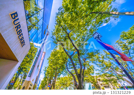 日本の東京都市景観 東京・表参道の緑溢れる並木やFENDIなどを望む