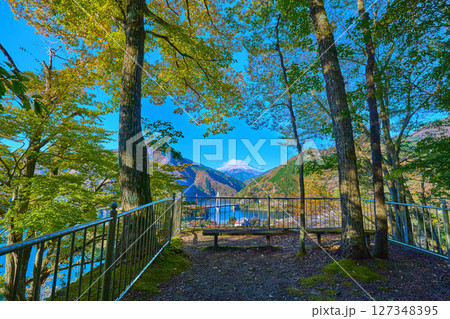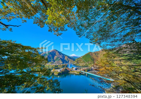 秋の神奈川県山北町の丹沢湖の千代の沢園地展望台から西側の眺望(丹沢湖,大仏大橋,紅葉,富士山など)