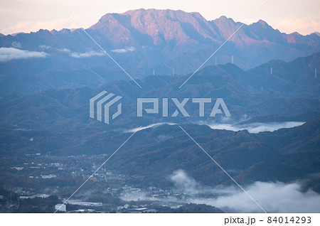 美の山山頂展望台から秩父盆地にかかる雲海に両神山