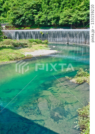 【梼原町「三嶋神社」参道 入口の鳥居と梼原川に架かる木製の神幸橋】