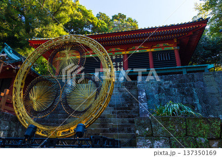 神奈川県足柄下郡箱根町元箱根にある箱根神社の湖水祭りに使われる船庫前の太鼓橋と芦ノ湖