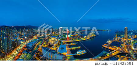 Panoramic of Cityscape and traffic at night in Kobe, Japan.