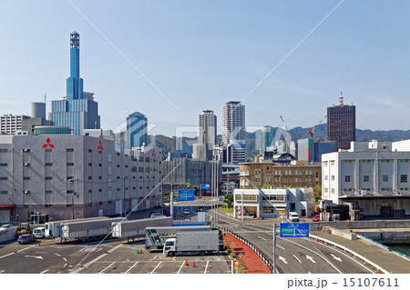 三宮のビル群と神戸港に停泊中の宮崎カーフェリーこうべエキスプレス 兵庫県神戸市中央区